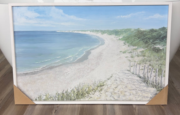 Create a serene arrangement with help from this Pristine Shores Wood Wall Decor. It features a white MDF frame with a painted illustration of grassy dunes and a sandy beach with calm blue waves on the shoreline. Display this in your bathroom with other nautical wall decor for a coordinated and peaceful look.