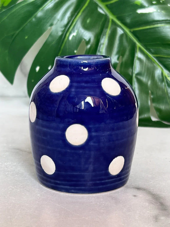 Welcome a pop of vibrant cheer into your home with this hand-painted blue polka dot bud vase! Perfectly petite at 3.5" tall and 2.75" wide, it will bring the right amount of summery spritz to your living space. Whether you're dressing up your kitchen counter, bathroom, coffee table or anywhere else, this cheerful vase will flower-power up your day!
