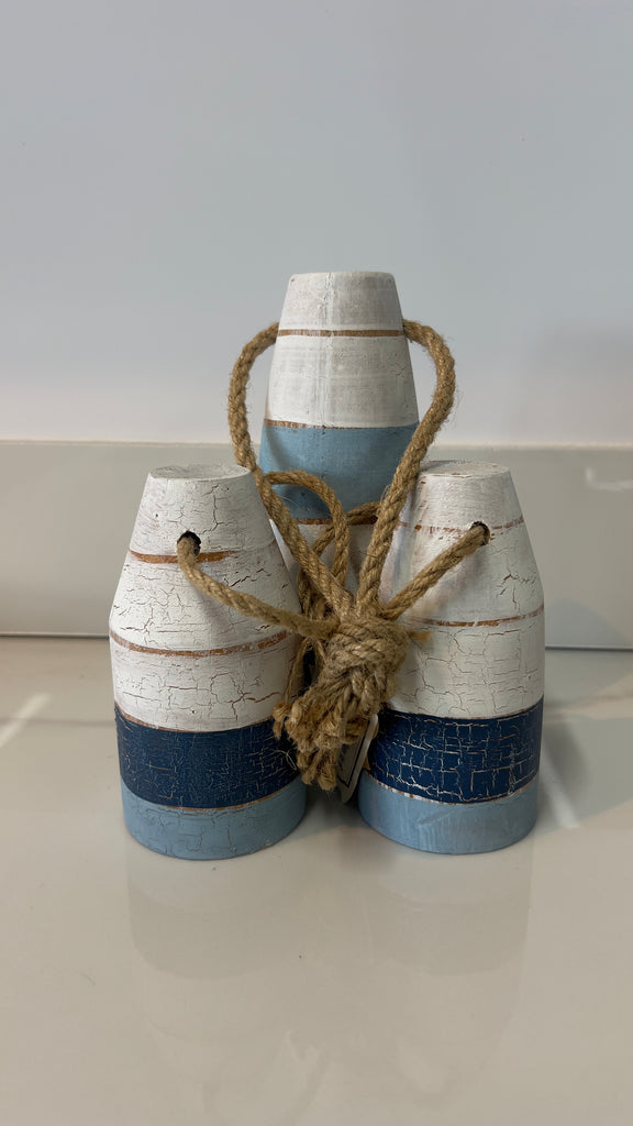 Give your nautical-themed room a rustic, colorful accent with Blue & White Wood Buoy. Boasting blue and white stripes with a crackled appearance, this adorable decor piece is simply perfect in bathrooms, man caves, and themed rooms. Float on in great style by placing this piece on your desk or countertop!