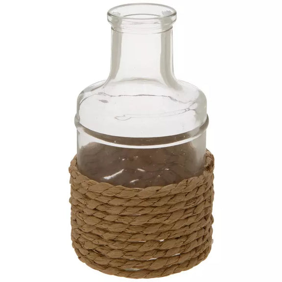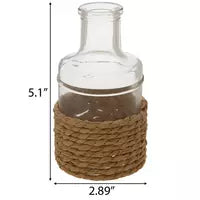Furnish your home with coastal accent pieces like this Glass Bottle With Rope! This decorative bottle has a clear body with beige rope wrapped around the bottom. Place a floral stem inside to create a beautiful statement piece on your mantel!