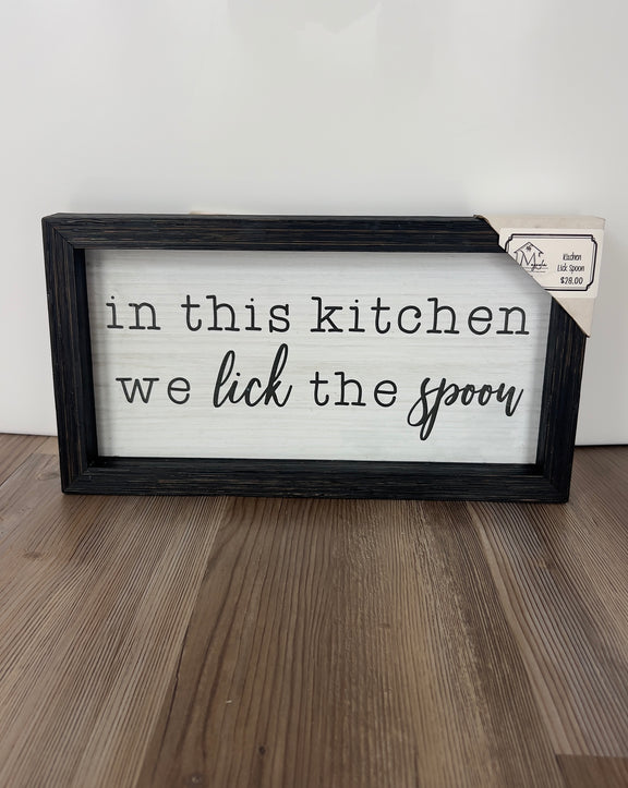 Let everyone know what kind of family you are with this Lick The Spoon Wood Wall Decor. This distressed black frame features a whitewashed insert with words in a black font. Add a rustic touch to your decor when you display this humorous piece.