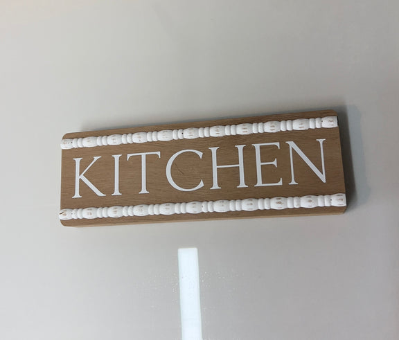 Add a touch of farmhouse charm to your home with this beautifully crafted wooden “Kitchen” sign. Featuring crisp white lettering and delicate carved bead detailing, it blends rustic warmth with timeless elegance. Perfect for propping on a shelf or styling as part of your kitchen décor, this versatile piece makes any space feel inviting and cozy.