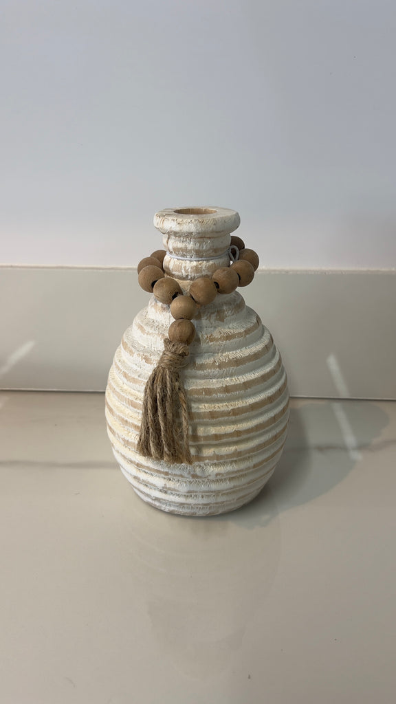 Incorporate a touch of boho design when you decorate with this White Wood Vase With Beaded Loop! This lovely vase has a ridged white body with intentional distressing. Hanging around its neck is a beaded loop with a jute tassel. Pair this piece with another vase for a beautiful appearance!