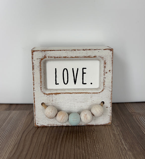 Add some charming accents to your home decor by displaying this Love Whitewashed Wood Decor. This piece features a block with a whitewashed finish with the word "Love" printed in black. A string of jute hangs underneath the phrase, with white and teal beads strung along it. Place this decor on your bedside table or desk to make sure every room feels comfy!