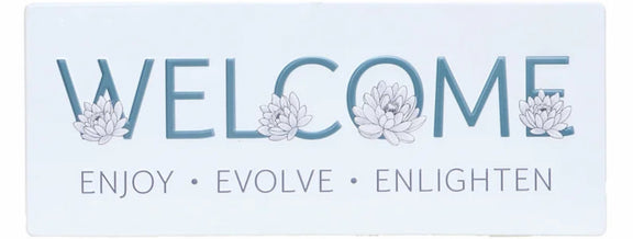 Get ready for the season with our 8x20in. “Welcome Enjoy, Evolve, Enlighten” metal wall sign. Each piece has a blue and white painted finish making it durable for both indoor and outdoor use. Whether it's used as a wall hanging or tucked into shelf decor, this sign creates a warm feel while adding depth to your space. This wall decor makes an excellent addition to any room and is the perfect decoration for spring and summer.