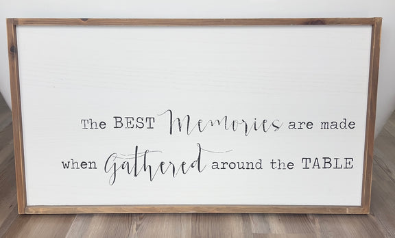 Best Memories Wood Wall Decor. This gorgeous piece boasts a white background with a woodgrain look and a brown frame. It features a loving phrase written in mixed print and script. Hang this piece near your dining table to encourage friends and family to gather for food and fun!