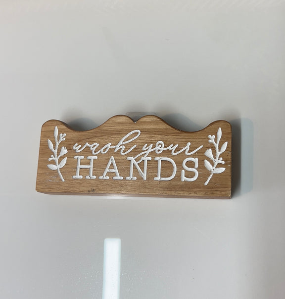 This wooden “Wash Your Hands” sign features elegant white script and leafy accents, perfect for adding a bit of farmhouse warmth to your bathroom, kitchen, or entryway. Small but full of character, it makes hygiene feel homey.